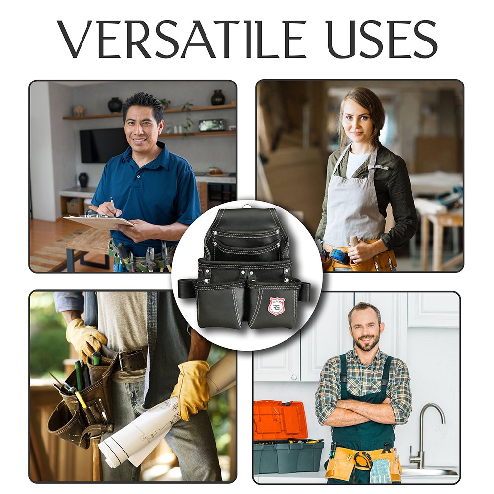 You can always keep all of your necessary equipment close at hand with this leather tool pouch. This bag is ideal for carpenters, electricians, and other tradesmen as it is made of sturdy finish leather. It contains double side hammer loop holder clip. Many compartments to store tools and fasteners. For increased durability, stress areas include rivet reinforcement.